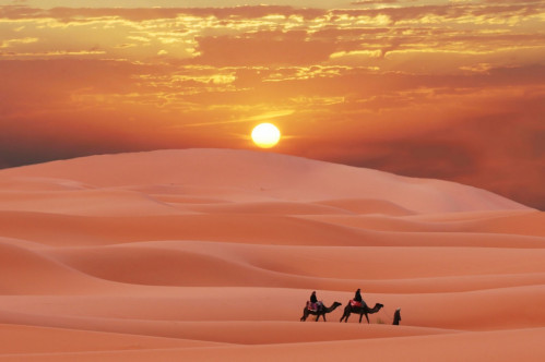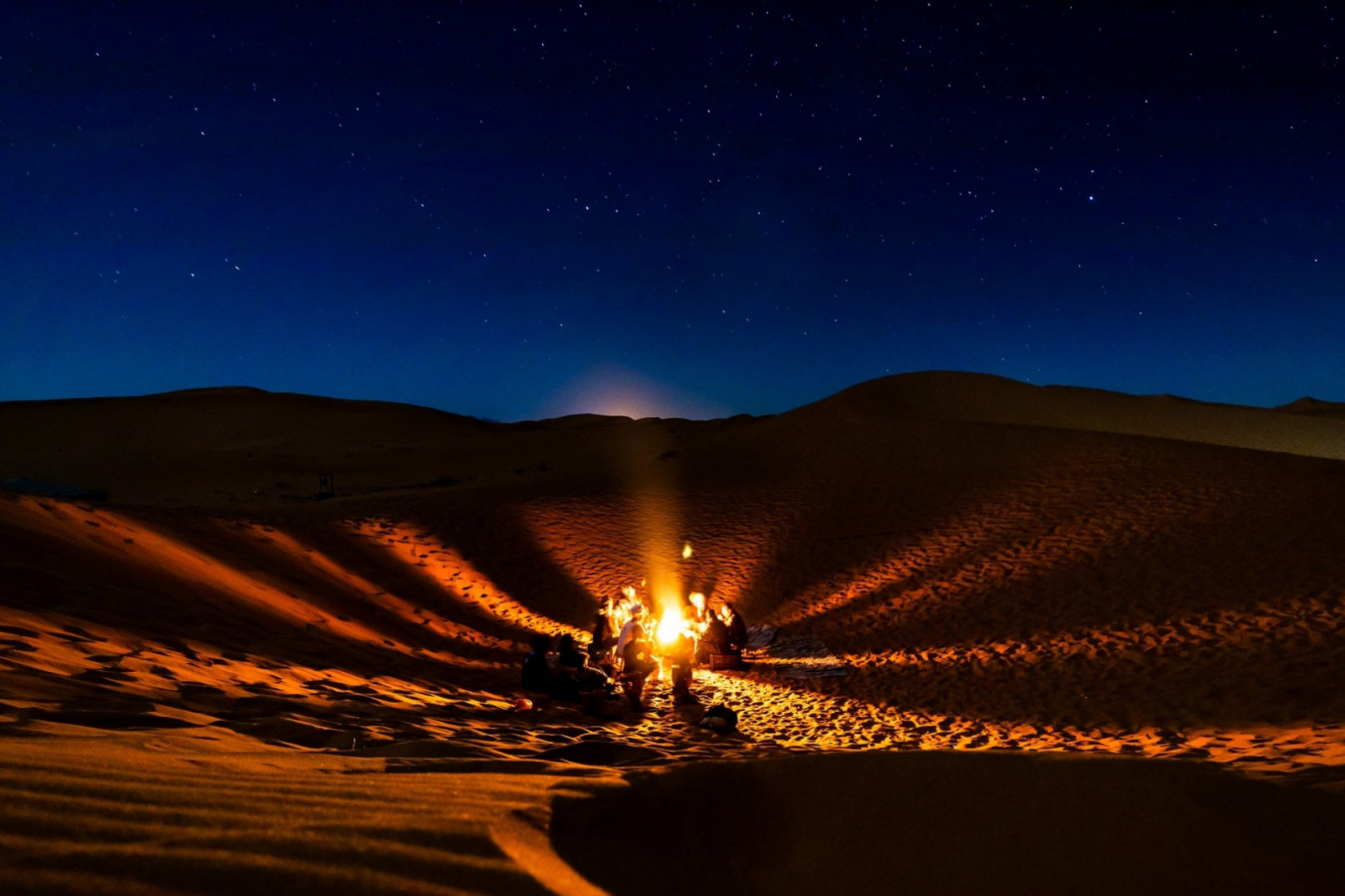 Llegue al desierto de Merzouga a última hora de la tarde, donde vivirá una experiencia única en la vida. Un amable nómada le llevará en su camello a través de las dunas de Erg Chebbi, cruzándolas tranquilamente hasta llegar a su campamento. Disfrute de la impresionante puesta de sol y de la hospitalidad bereber en el campamento, seguido de una cena y una noche muy relajante. Únase a una animada hoguera y a la música bereber interpretada con instrumentos tradicionales por el personal del campamento. Al final, habrá tiempo para que los participantes aprendan a tocar los instrumentos.
